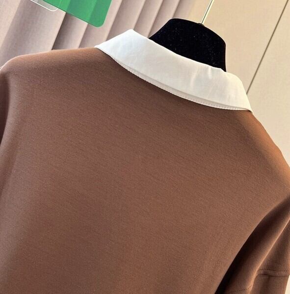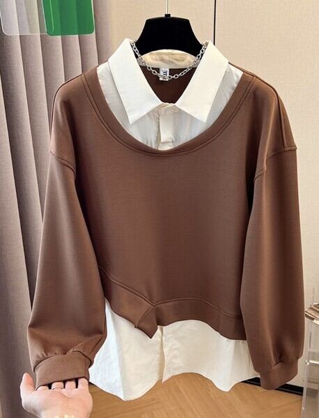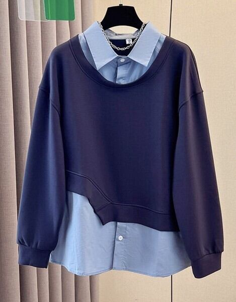 ・レイヤード風デザインのスウェットシャツとシャツの一体型トップス。